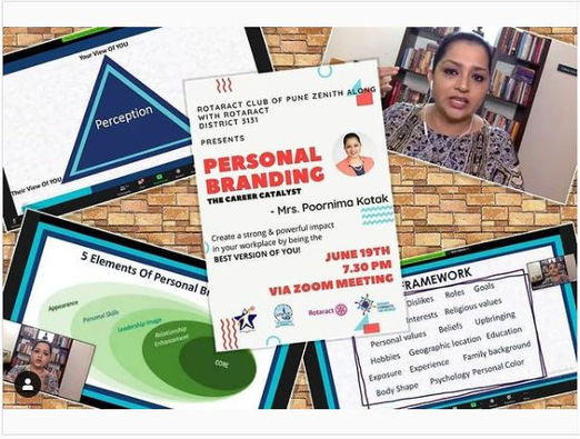 "Everything about you is part of your branding - Poornima Kotak. We, RAC Pune Zenith along with Rotaract District 3131 successfully hosted an e-District PD session on, Personal Branding The Career Catalyst ```with our India's leading Personal Branding Alchemist; Ms. Poornima Kotak. It was a very insightful session where our speaker enlightened us on Personal branding; where you align all your personal capabilities, package them in the most appropriate manner, create a branding that speaks about you and projects you in the best possible manner to the world. Thus creating a strong & powerful impact in your workplace by being the BEST VERSION OF YOU! The session was also graced by 50+ Rotaractors. We thank all those who participated in this webinar.